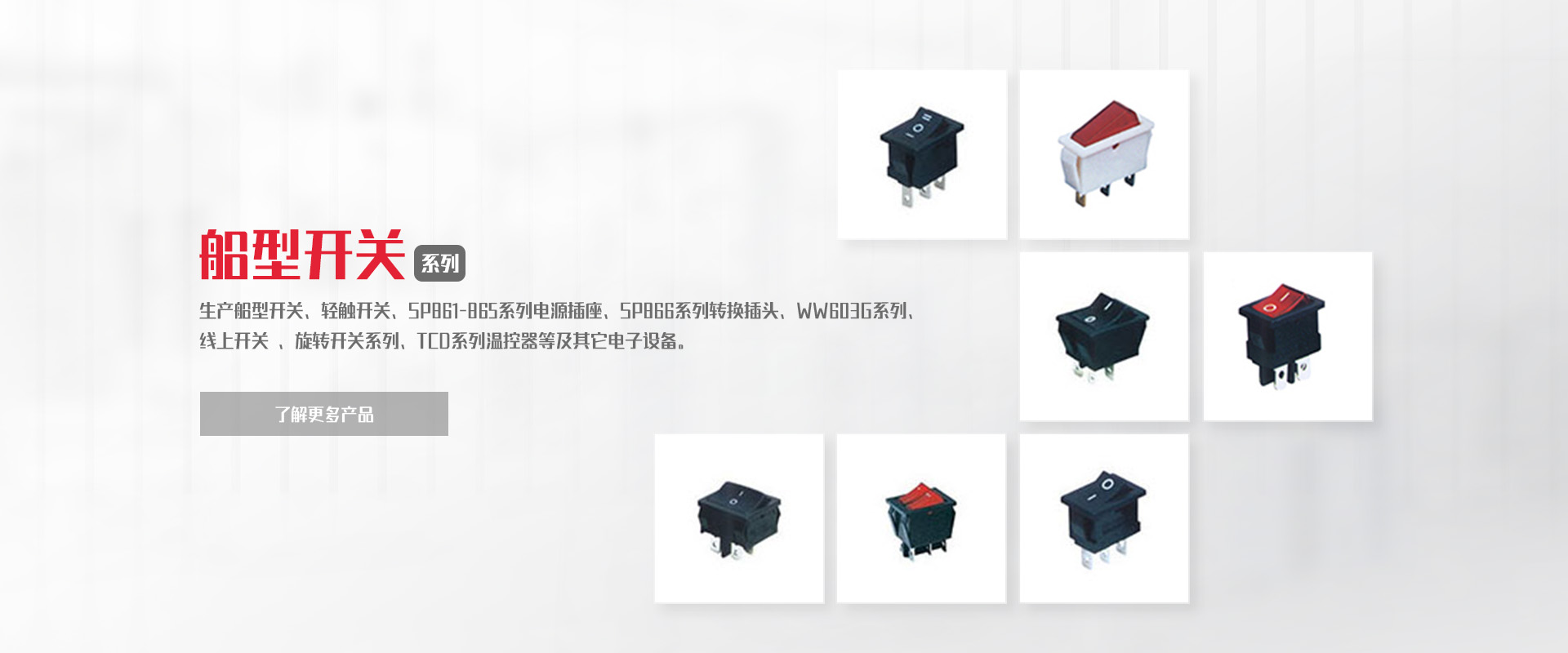 公司專業(yè)生產船型開關、輕觸開關、SP861-865系列電源插座、SP866系列轉換插頭、WW11系列微動開關、WW01-03、09系列按鈕開關DS、WW系列指示燈開關、WW603G系列 線上開關 、旋轉開關系列、TCD系列溫控器等及其它電子設備。